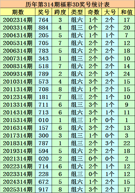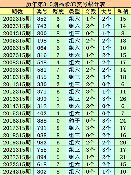 在以上奖号中奖,积年第315期福彩3D出现1次豹子,出现6次组三,出现15次组六。组六开出比例较高,本期陆续眷注组六。
