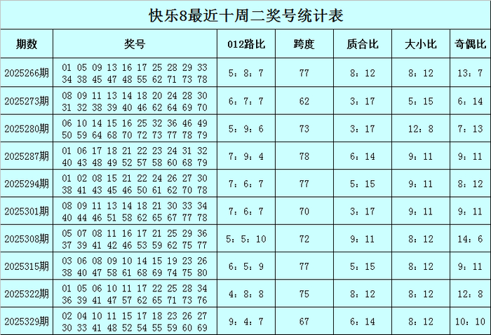 福彩适意8第2025329期(上周二)开奖转头:02 04 10 11 15 17 18 23 26 27 30 33 41 48 52 54 55 59 60 69,其中奖号012路比为9:4:7,跨度为67,质合比为6:14,大小比为8:12,奇偶比为10:10。