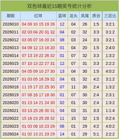 上期奖号统计中,红球质合比为5:1、三区比为2:2:2、龙头号码为01,凤尾号码为29。