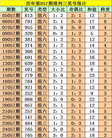 积年第057期胪列三奖号中,开出次数最多三码为:0、6、7,本期珍重号码:7。